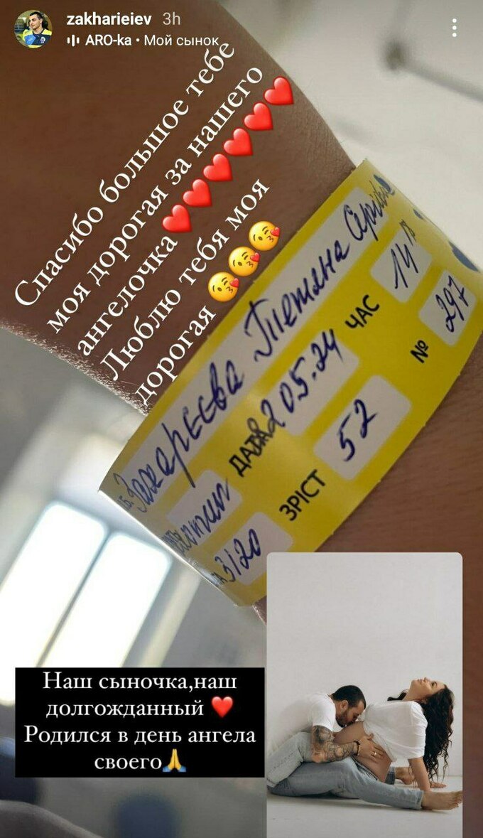 «Спасибі велике тобі, моя люба, за нашого янголятка. Кохаю тебе. Наш синочок, наш довгоочікуваний. Народився у день свого ангела», – сказав Захарєєв.