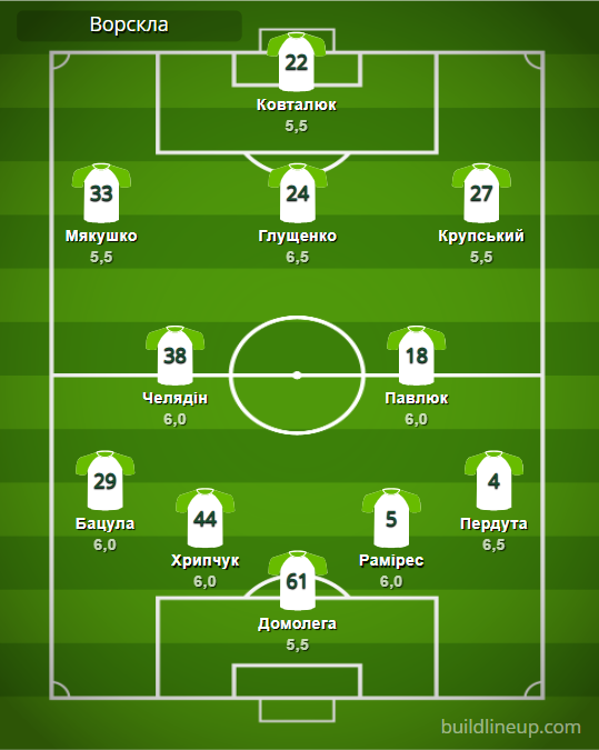 «Ворскла»: Домолега – Бацула, Хрипчук (Толі, 67), Рамірес (Островський, 80), Пердута – Челядін (Скляр, 46), Павлюк – Мякушко (Кане, 46), Глущенко, Крупський – Ковталюк (Феліпе, 67).