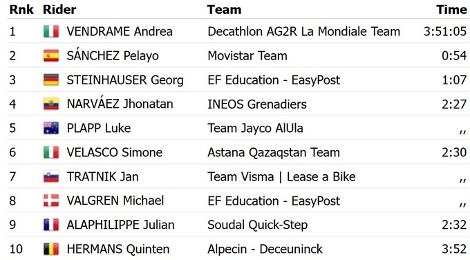 Італійський велогонщик команди «Decathlon Ag2r» Андреа Вендраме завдяки сольній атаці з відриву виграв 19-й етап Джиро д'Італія-2024. Він випередив іспанця Пелайо Санчеса з «Movistar» і німця Георга Штайнхаузера з «EF Education EasyPost».