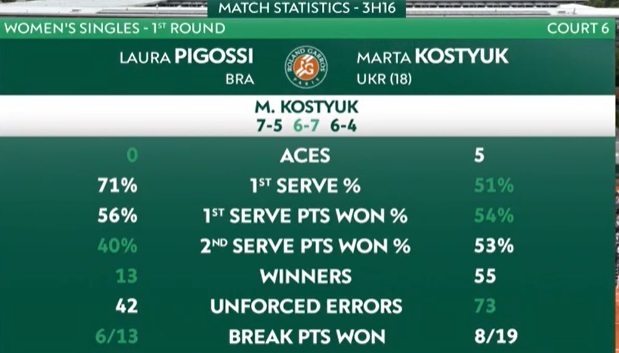 Марта Костюк (Україна) [18] – Лаура Пігоссі (Бразилія) [Q] – 7:5, 6:7(4), 6:4