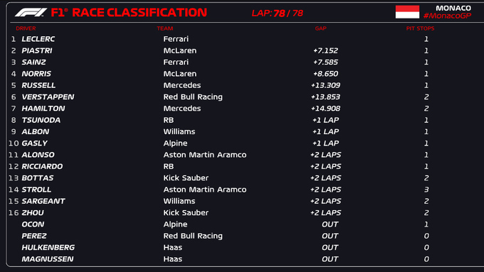 Леклер, Піастрі, Сайнс та Норріс йшли близько один до одного, але шансів атакувати не мали. За підсумками гонки Леклер трохи скоротив відставання від Ферстаппена у загальному заліку, а Ландо Норріс обійшов Переса і вийшов на третє місце.