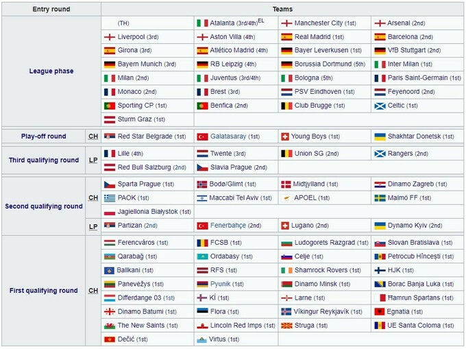 У Лізі чемпіонів 2024/25 вже відомі 28 із 36 команд-учасниць основного раунду. Ще однією стане або Шахтар (якщо Реал виграє ЛЧ), або Айнтрахт (якщо Боруссія Д виграє ЛЧ). Сім місць буде розіграно у кваліфікації (5 за Шляхом чемпіонів та 2 за Шляхом представників ліг).
