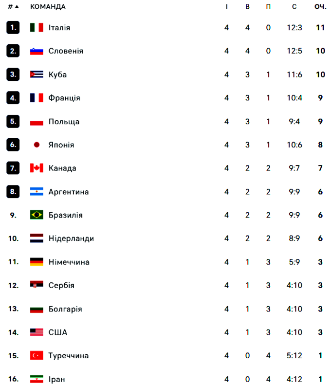 Звернемо також увагу на збірну Куби, яка йде на третьому місці із 10 набраними очками. В активі кубинців є перемоги над Бразилією, Німеччиною та Іраном з однаковим рахунком 3:1, і лише Японії вони поступилися 2:3.