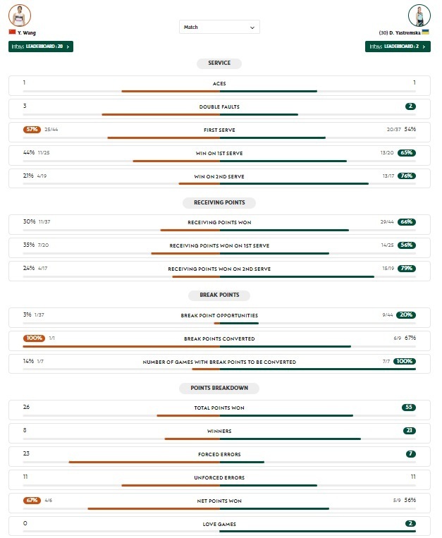 Даяна Ястремська (Україна) – Ван Яфань (Китай) – 6:2, 6:0