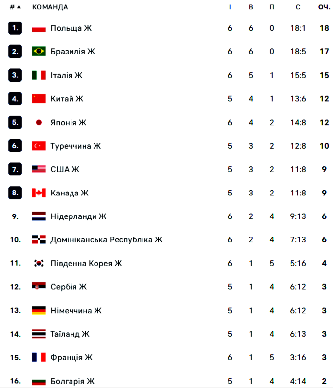 Відмінно виступають поки що збірні Польщі та Бразилії, які не програли жодного поєдинку, при цьому європейські волейболістки набрали максимальну кількість очок, 18. Напередодні польська команда завдала поразки Сербії 3:1, а сьогодні без особливих проблем розправилася із суперницями з Південної Кореї 3:0.