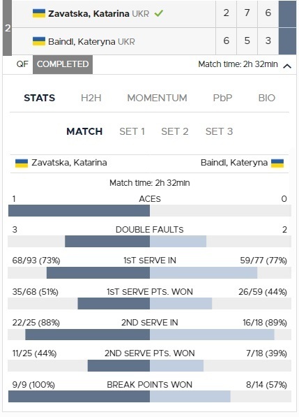 У матчі 1/4 фіналу Катя обіграла ще одну українку Катерину Байндл (№167 WTA), яка отримала четвертий номер посіву.