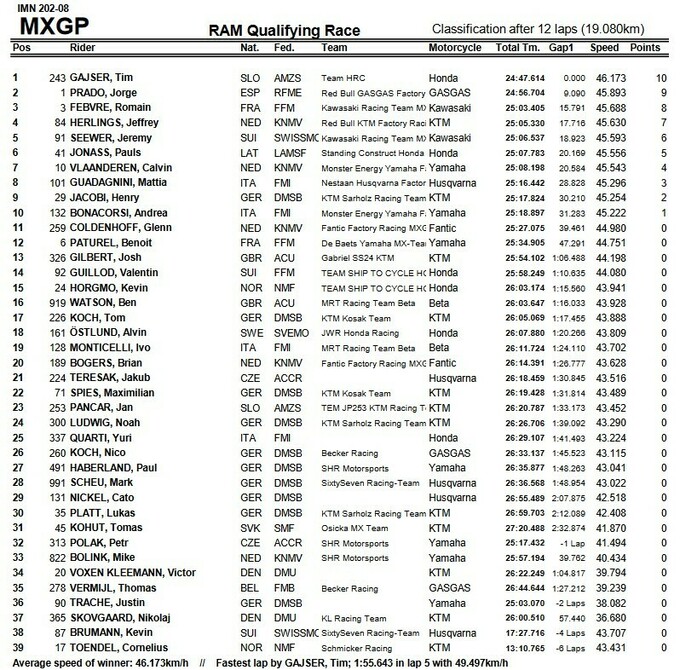 Перемога у дощовій кваліфікації стала для словенського райдера третім поулом цього сезону. Другий результат показав чинний чемпіон світу Хорхе Прадо із GASGAS, а замкнув першу трійку лідер Кавасакі Ромен Февр.