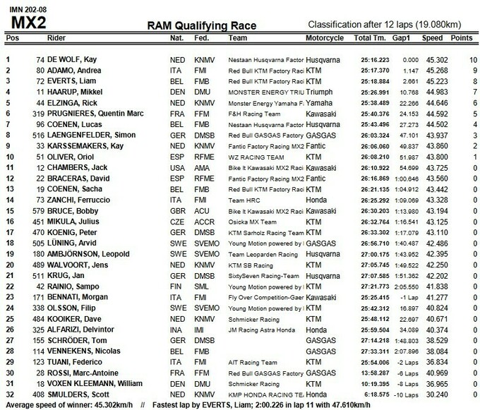 У класі MX2 поул взяв Кай де Вольф із заводської команди Хускварна – також втретє цього сезону. Друге та третє місця посіли райдери заводської команди КТМ Андреа Адамо та Ліам Евертс.