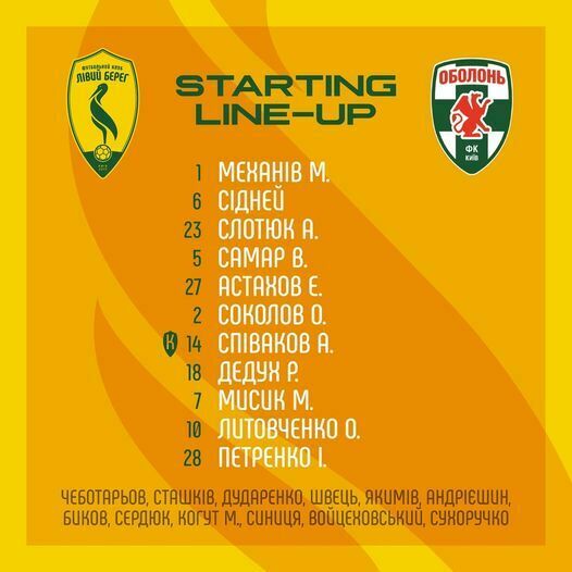 «Лівий берег»: Механів – Сіднней, Самар, Слотюк, Астахов (Синиця, 46) – Мисик (М. Когут, 58), Дедух, Співаков (Якимів, 84), Соколов – Петренко (Сухоручко, 46), Литовченко (Войцеховський, 68).