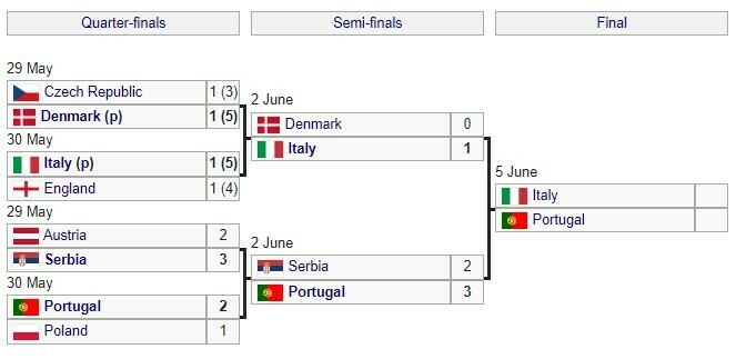 Фінальний матч між Італією та Португалією відбудеться 5 червня у Лімассолі, гра за третє місце не передбачена.