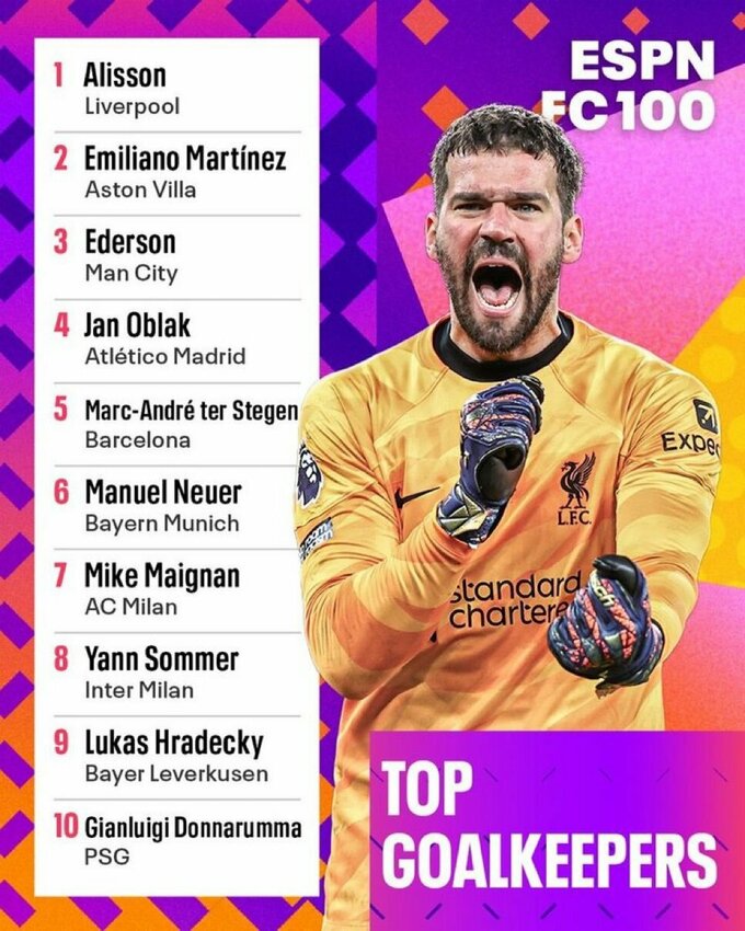 Відомий портал ESPN поділився рейтингом найкращих воротарів сезону 2023/24.