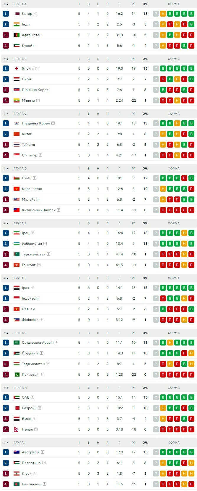Турнірні таблиці кваліфікації ЧС-2026. В Азії зіграно 5 турів, хто лідер?