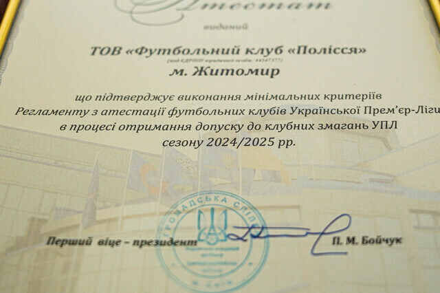 7 червня генеральний директор «Полісся» Володимир Загурський отримав почесний атестат, що дозволяє команді взяти участь в розіграші УПЛ сезону (2024/2025). Нагадаємо, що формат змагань залишиться незмінним: 16 команд-учасниць зіграють між собою в два кола (вдома та на виїзді).