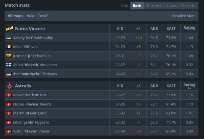 У матчі першого туру групового етапу «народжені перемагати» обіграли колектив із Данії – Astralis. Зустріч проходила у форматі bo3 (best of 3). NaVi виграли обидві карти.
