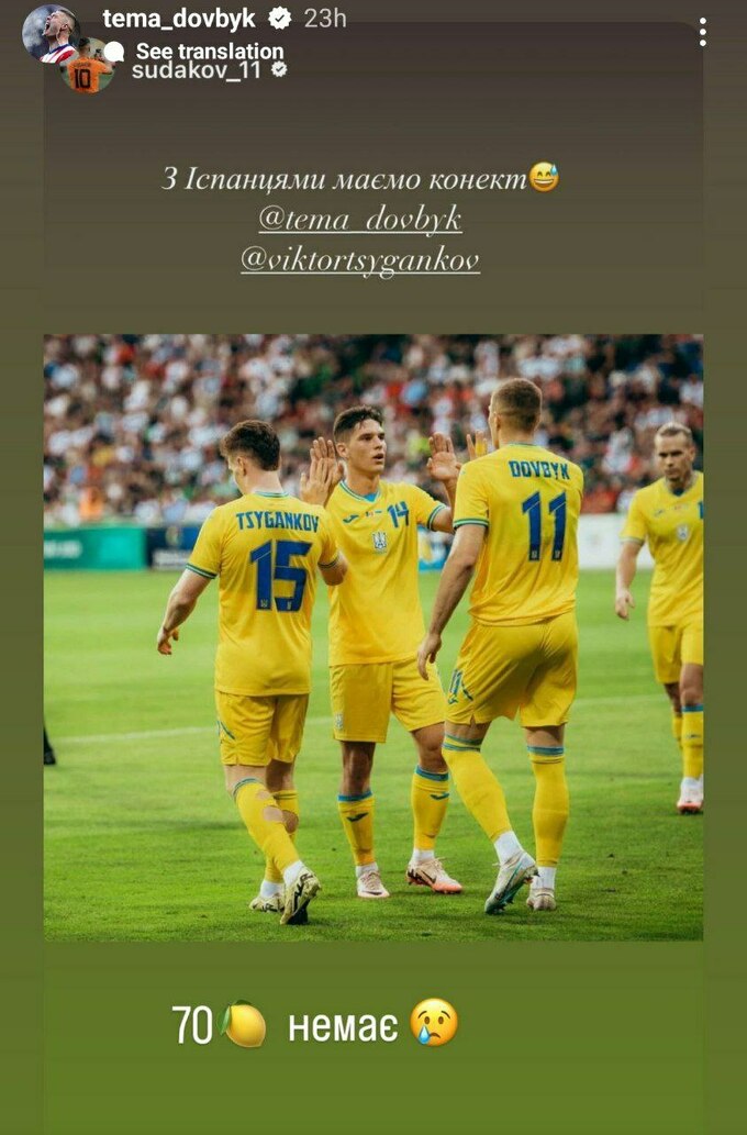 Судаков, крім забитого м'яча, також віддав два асисти: на Циганкова та Довбика. Після завершення зустрічі Георгій опублікував знімок з Віктором та Артемом у своєму Instagram, залишивши кумедний підпис: «З іспанцями маємо конект».