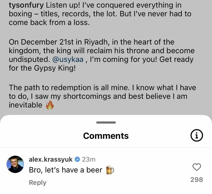 Промоутер Усика Олександр Красюк відреагував на це відео, та залишив коментар під дописом Тайсона.