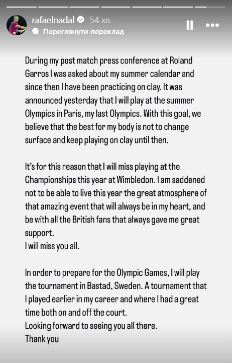 З цією метою ми вважаємо, що краще для мого тіла – не змінювати покриття і доти продовжувати грати на ґрунті. Саме з цієї причини я пропущу участь у чемпіонаті цього року на Вімблдоні», – написав Надаль у сторіз інстаграму.
