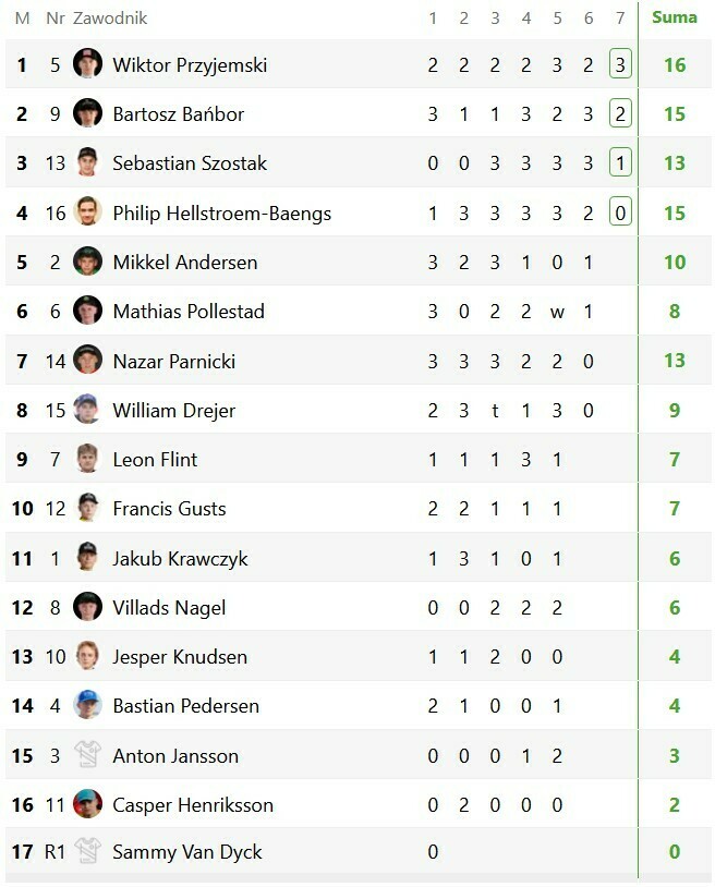Топ-10: Пшіємські, Баньбор, Шостак, Хеллстрьом-Бенгс, Андерсен, Поллестад, Парницький, Дрейєр, Флінт, Густс.