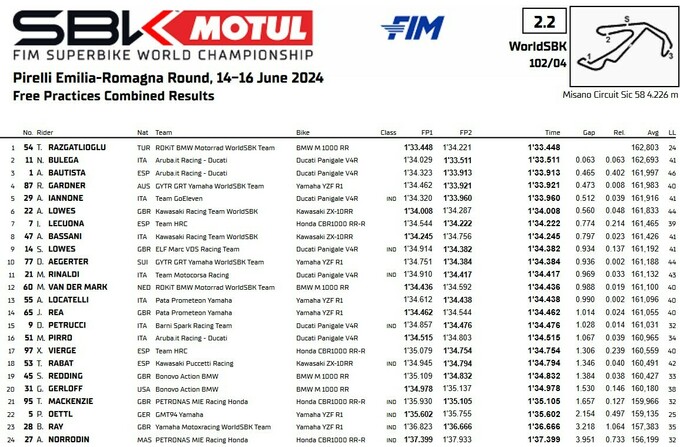 Разгатлиолу впевнено виграв першу сесію, у другій показав п'ятий час і цього йому вистачило для кращого результату за сумою. У першу трійку також увійшли обидва райдери заводської команди Дукаті – Ніколо Булега став другим, а чинний чемпіон WorldSBK Альваро Баутіста показав третій результат.