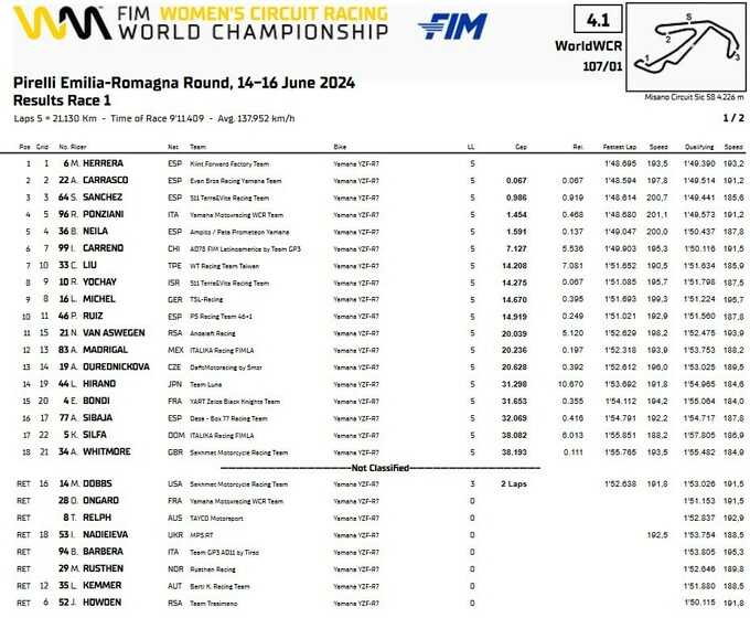 Іспанка Марія Еррера виграла першу гонку Раунда Емілії-Романьї, стартового етапу жіночого чемпіонату світу з кільцевих мотоперегонів WorldWCR, який проходить на трасі імені Марко Сімончеллі у Мізано-Адріатико. Другою стала Ана Карраско, а третє місце посіла Сара Санчес.