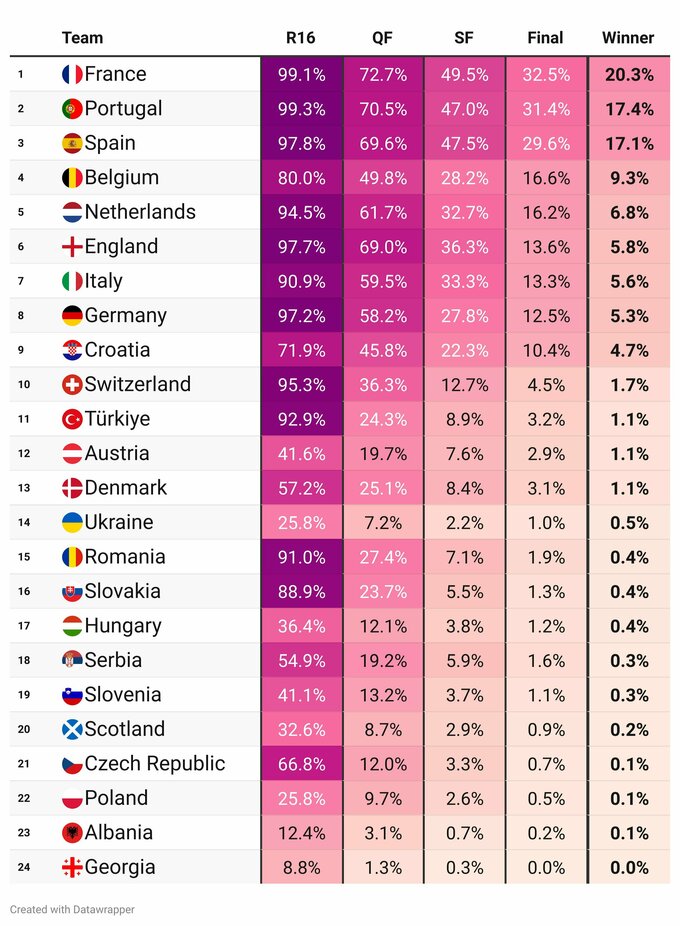 Аналітики зі Swiss Football Data оновили свій прогноз на результат Євро-2024 у Німеччині після завершення матчів першого туру групового етапу.