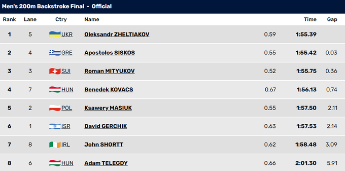 Олександр став першим на дистанції 200 метрів на спині, випередивши Сіскоса на 0.03 сек