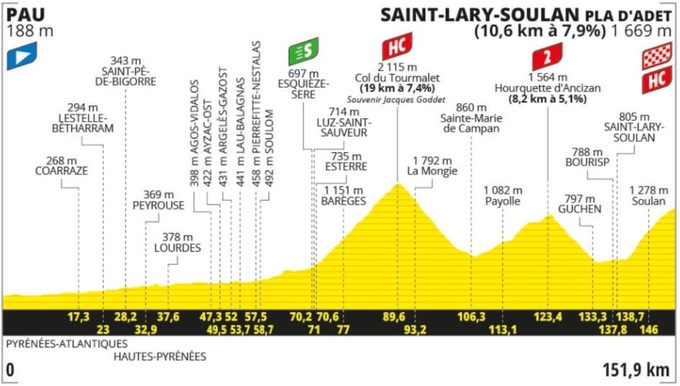 Спочатку – легендарний Коль ду Турмале з боку Луз-Сен-Совюра: 18,7 км із середнім градієнтом 7,4% і вершиною на висоті 2115 метрів. Потім – Уркетт д'Ансізан: 8,2 км, 5,1% з двома полками, які розбивають підйом на три практично рівні частини. Після цього – спуск до Сент-Ларі-Сулан і штурм важкого фінального підйому на Пла д'Аде: 10,6 км, 7,9%.