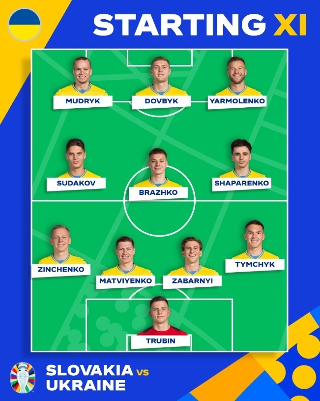 Україна: Трубін, Зінченко, Матвієнко, Забарний, Тимчик, Бражко (Сидорчук, 85), Судаков, Шапаренко (Таловєров, 90+2), Мудрик (Маліновський, 85), Ярмоленко (Зубков, 67), Довбик (Яремчук, 67).