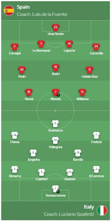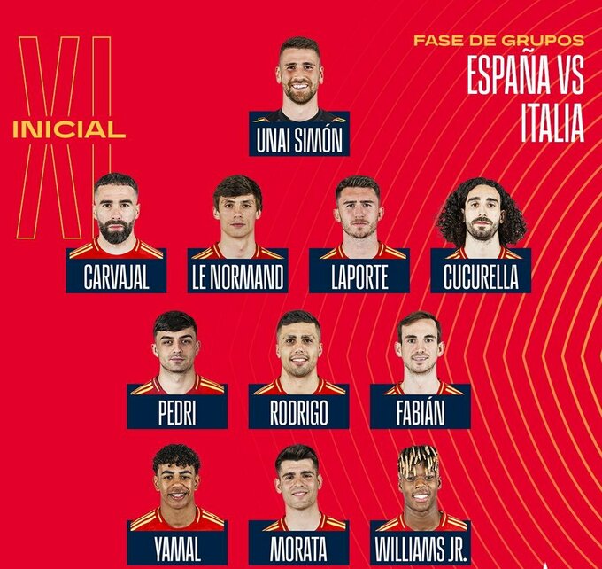 Іспанія: Унаї Сімон, Карвахаль, Ле Норман, Ляпорт, Кукурелья, Педрі, Родріго, Фабіан, Ямал, Мората, Вільямс.