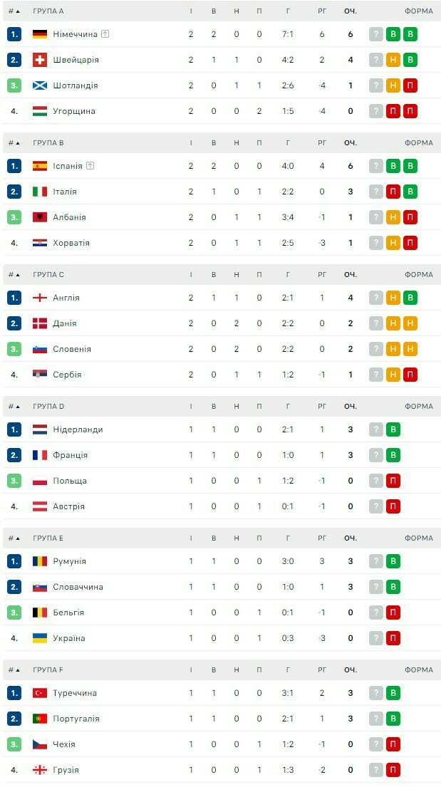 Таблиці Євро-2024. Іспанія стала другою командою, що вийшла у плей-оф