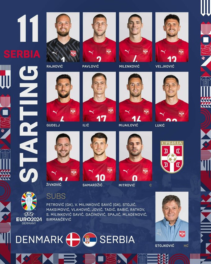 Стали відомі стартові склади на матч Євро-2024 між Данією та Сербією