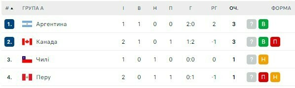 Турнірне становище: Аргентина та Канада (по 3 очки), Чилі та Перу (по 1 очку).