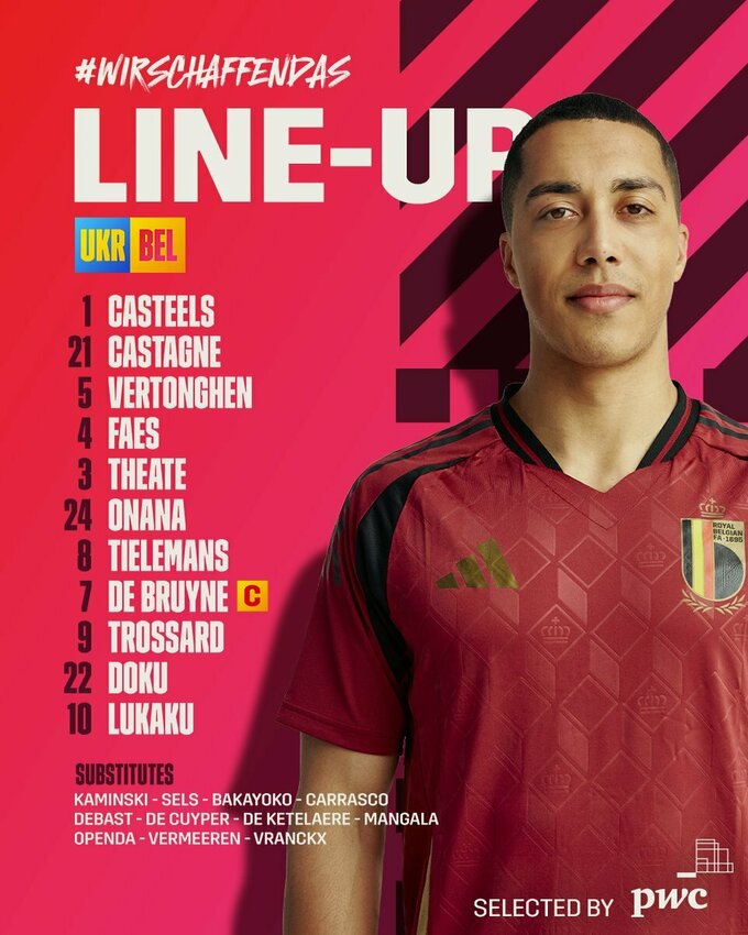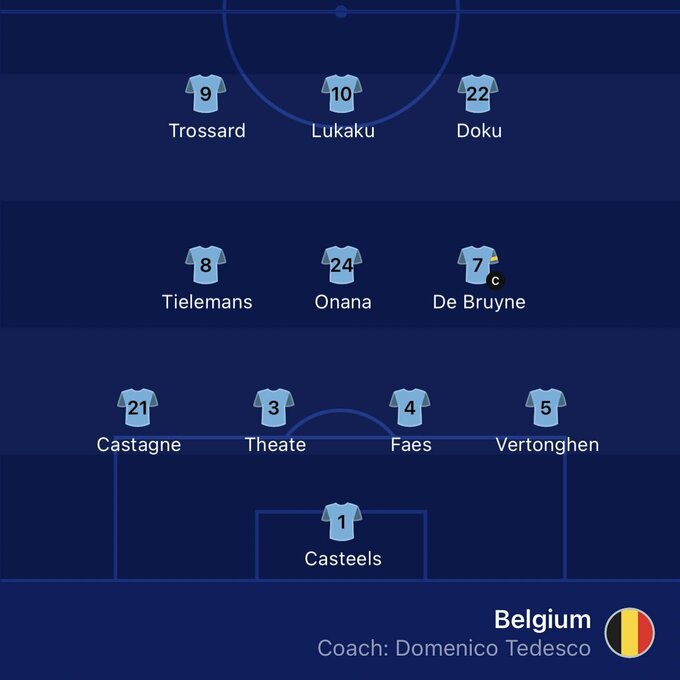 Бельгія: Кастелс, Кастань, Теат, Фас, Вертонген, Тілеманс, Онана, Де Брюйне, Троссард, Лукаку, Доку