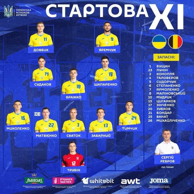 Україна: Трубін, Миколенко, Матвієнко, Сваток, Забарний, Тимчик, Судаков, Бражко, Шапаренко, Довбик, Яремчук