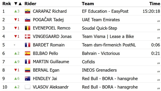 Жовту майку лідера загального заліку перехопив еквадорський велогонщик команди «EF Education EasyPost» Річард Карапас. Олімпійський чемпіон Токіо за сумою місць випереджає Тадея Погачара, Йонаса Вінгегора та Ремко Евенпула, які йдуть з ними в один час.