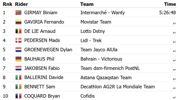 Переможцем третього етапу Тур де Франс-2024 став еритрейський велогонщик команди «Intermarche Wanty» Біньям Гірмай. У фінішному спринті в італійському Турині він випередив колумбійця Фернандо Гавірію з «Movistar» і чемпіона Бельгії, Арно Де Лі з «Lotto Dstny».