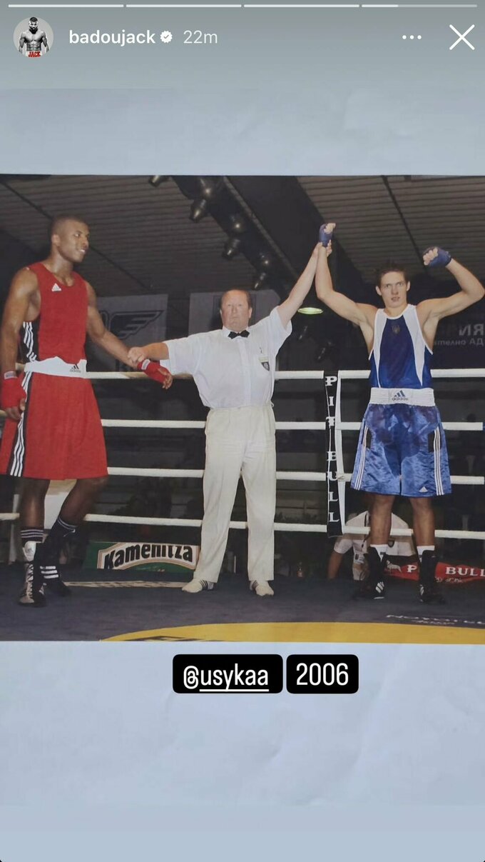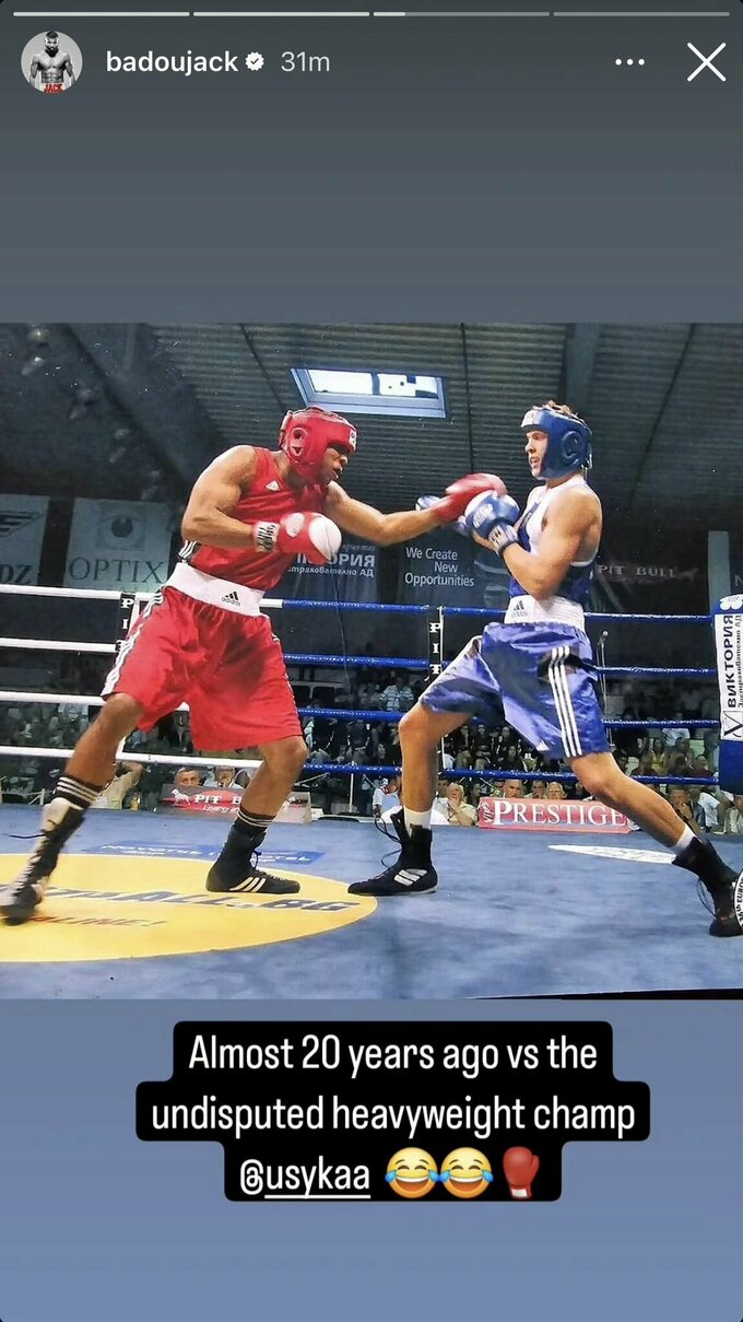 «Майже 20 років тому я бився проти абсолютного чемпіона Усика», – підписав фото Баду Джек.