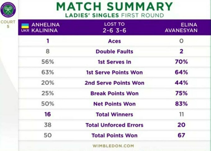 Калініна стала третьою представницею України, яка вилетіла з Вімблдону. Раніше виступи завершили Леся Цуренко та Катерина Байндл.
