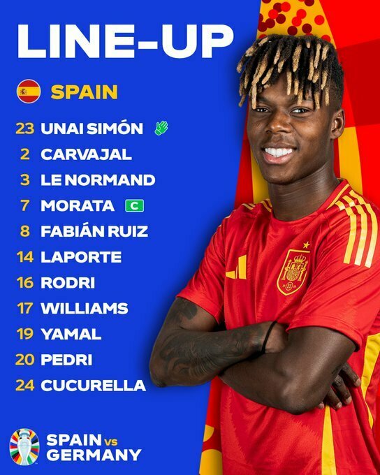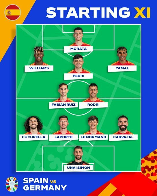Іспанія: Сімон – Кукурелья, Лапорт, Ле Норман (Начо, 46), Карвахаль – Руїс, Педрі (Ольмо, 8), Родрі – Вільямс (Оярсабаль, 79), Мората (Меріно, 79), Ямал (Ферран Торрес, 62).