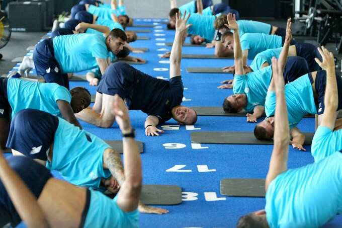 Біло-сині провели чергове тренування. Розпочалося воно з роботи у фітнес-залі, де динамівці виконали комплекс вправ на розтяжку та зміцнення м’язів-стабілізаторів.