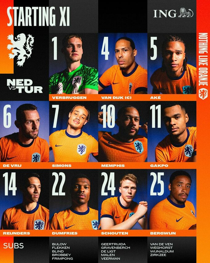 Нідерланди: Вербрюгген, ван Дейк, Аке, де Врей, Думфріс, Схаутен, Рейндерс, Сімонс, Гакпо, Депай, Бергвейн.