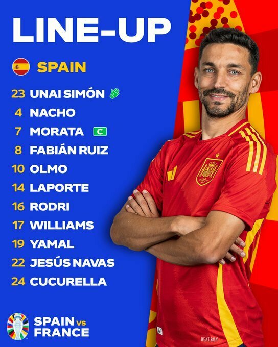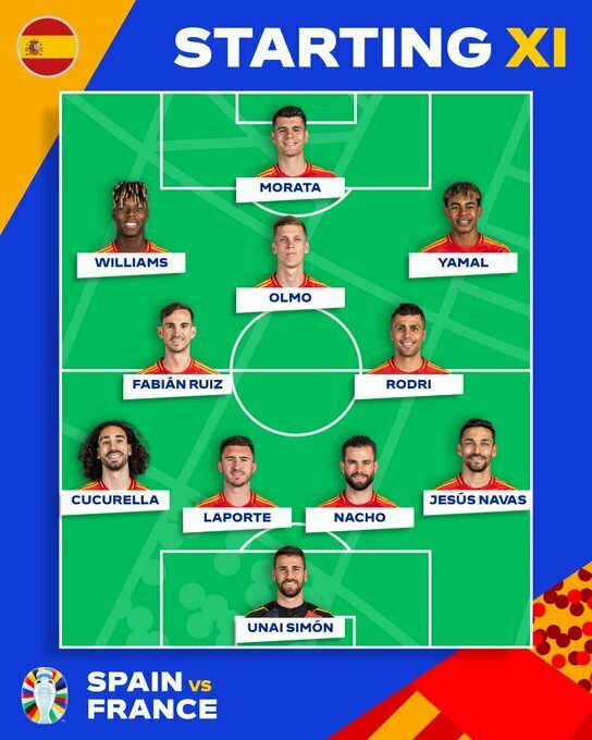Іспанія: Сімон – Кукурелья, Лапорт, Фернандес, Навас (Вівіан, 57) – Руїс, Родрі – Вільямс (Субіменді, 90+4), Ольмо (Меріно, 76), Ямал (Торрес, 90+4) – Мората (Оярсабаль, 76).