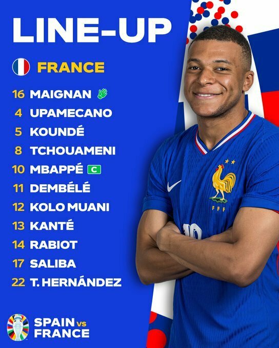У вівторок, 9-го липня, відбудеться півфінальний поєдинок чемпіонату Європи-2024, у якому змагатимуться Іспанія та Франція. Матч відбудеться в Мюнхені (Німеччина), на полі стадіону «Альянц Арена», початок о 22:00.