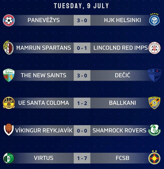 Великі перемоги здобули команди Паневежис (Литва), Нью-Сейнтс (Уельс), ФКСБ [колишній Стяуа] (Румунія).