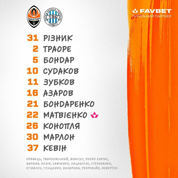 Запас: Кравець, Твардовський, Вінісіус, Педро Енріке, Фарина, Козік, Савченко, Лацабідзе, Степаненко, Егіналду, Глущенко, Назарина, Педріньо, Невертон.