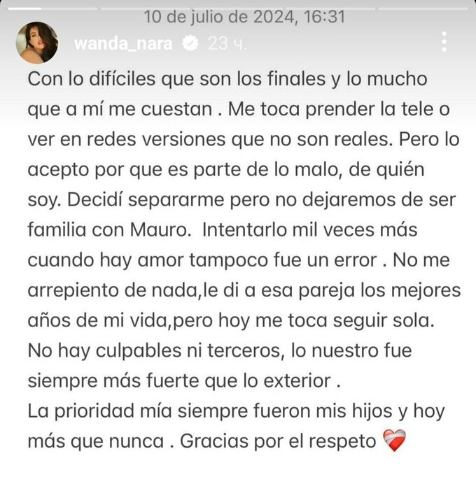 Я ні про що не шкодую. Я віддала нашим стосункам найкращі роки свого життя, але зараз мені потрібно побути самій. Тут немає винних чи сторонніх: ми завжди були сильніші за зовнішні обставини. Для мене завжди на першому місці були мої діти, а сьогодні — вони важливіші за все інше. Дякую за розуміння», — написала Ванда у своєму Instagram.