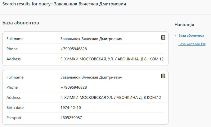 Дані Завальнюка можна знайти у відкритому доступі жителів росії