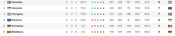 Україна: Колаволе 7 + 4 підбирання, Скутельник 15 + 5 передач, Холод 8, Ніколайчук 2, Сипало 15 + 16 підбирань – старт; Кабанов 14 + 4 підбирання + 6 передач, Карасьов 10 + 4 підбирання, Кличко 6 + 6 підбирань, Новіков 4, Чорногрицький 0