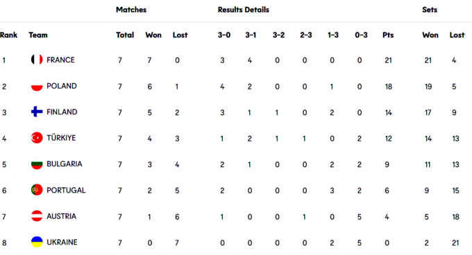 Суперників українців дуже зачепило, що вони програли партію головним аутсайдерам і в третьому сеті вони просто знищили опонентів 25:9. У четвертій партії знову була боротьба, де наприкінці збірна Франції перемогла 25:23.