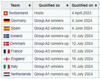 За підсумками групового етапу кваліфікації путівки до фінального турніру чемпіонату Європи, який проходитиме з 2 до 27 липня 2025 року в Швейцарії, здобули по дві найкращі команди кожної групи Ліги А – Данія, Англія, Франція, Німеччина, Ісландія, Італія, Нідерланди та Іспанія. Ще одним учасником є збірна господарів (Швейцарія).